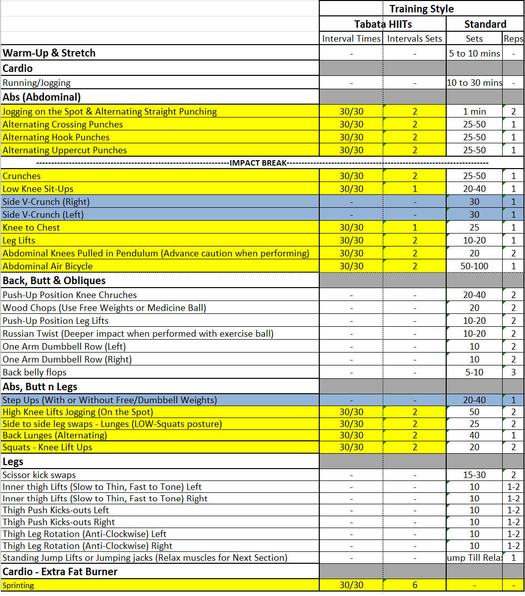 Tabata HIITs Style - When doing this style of training follow the exercises highlighted in Yellow for each section and if there isn't section with Yellow Highlighted, revert back to 'Standard Style' Training (This should only happen for back exercise section). Sections highlighted in Blue aren't supposed to be performed if your doing Yellow Impact sections for your HIITs workout day.